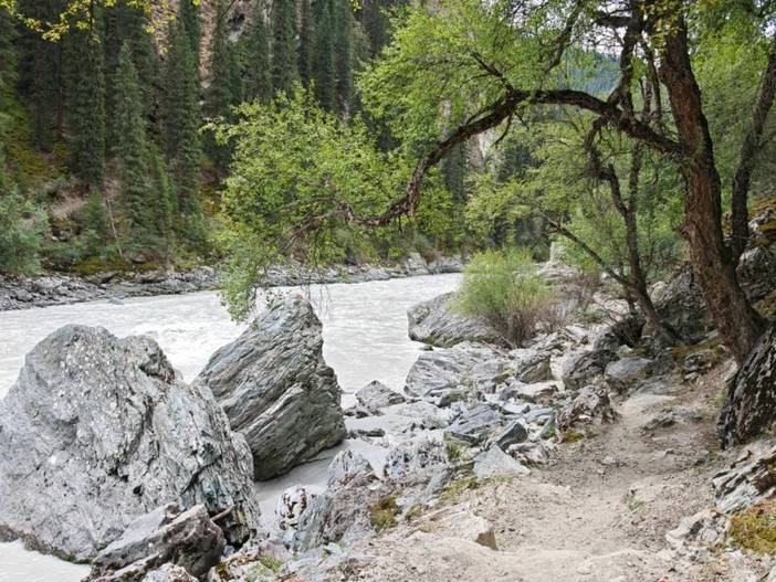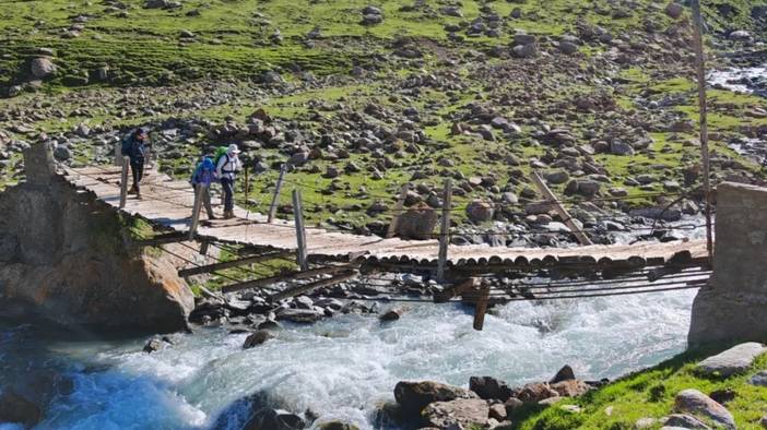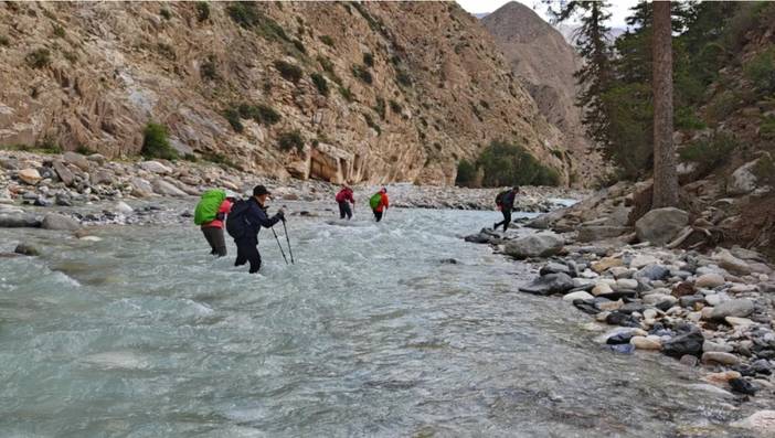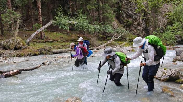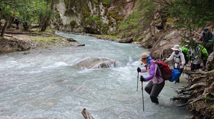 一是第三天的过河,过河全部是在丛林里的,相当于丛林里的溪流,是否刚下过雨决定水的深浅。这一天的过河比较凉,并且水是清澈、蓝绿色的,风景也好看。第三天的河又分为两段,一段是比较浅的,另外一段是过了科克苏河的溜索桥(以前是溜索,现在修了桥)后,相对比较深。