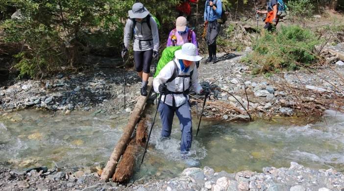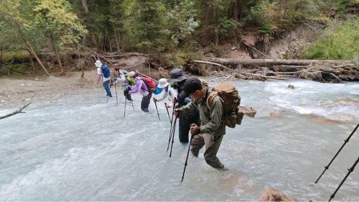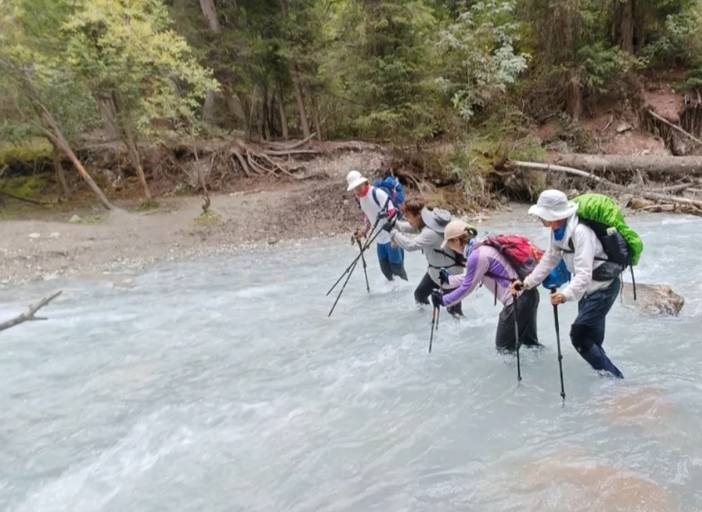 过河是有技巧的,必须面朝水的上游,用登山杖支撑,也有一些其他技巧,我们在过河前会讲。