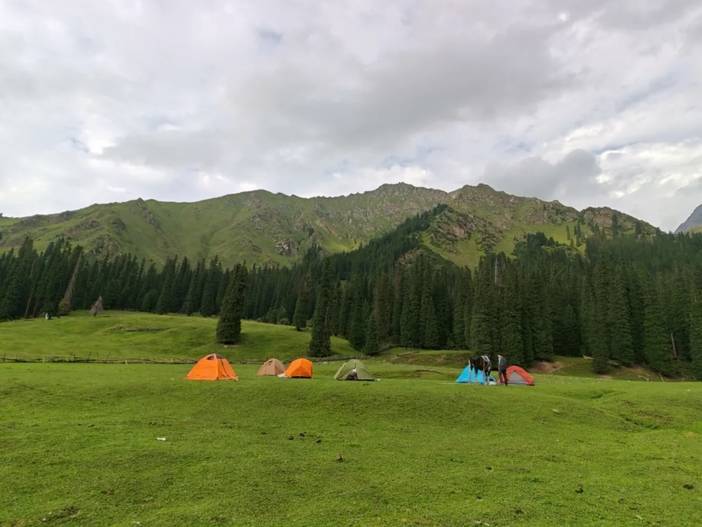 过完河以后,又是缓慢的拔高,穿越云杉林,到达我们今天的营地,草原站,海拔2200米左右,相对舒适。