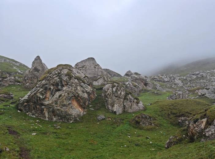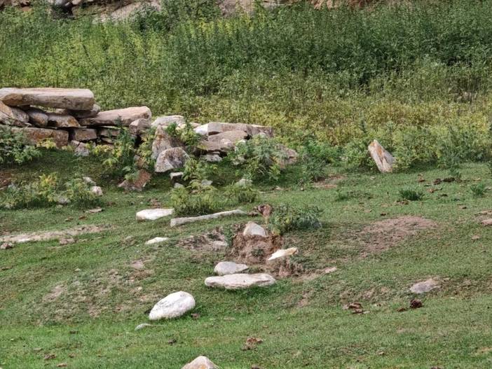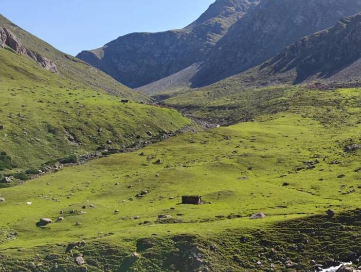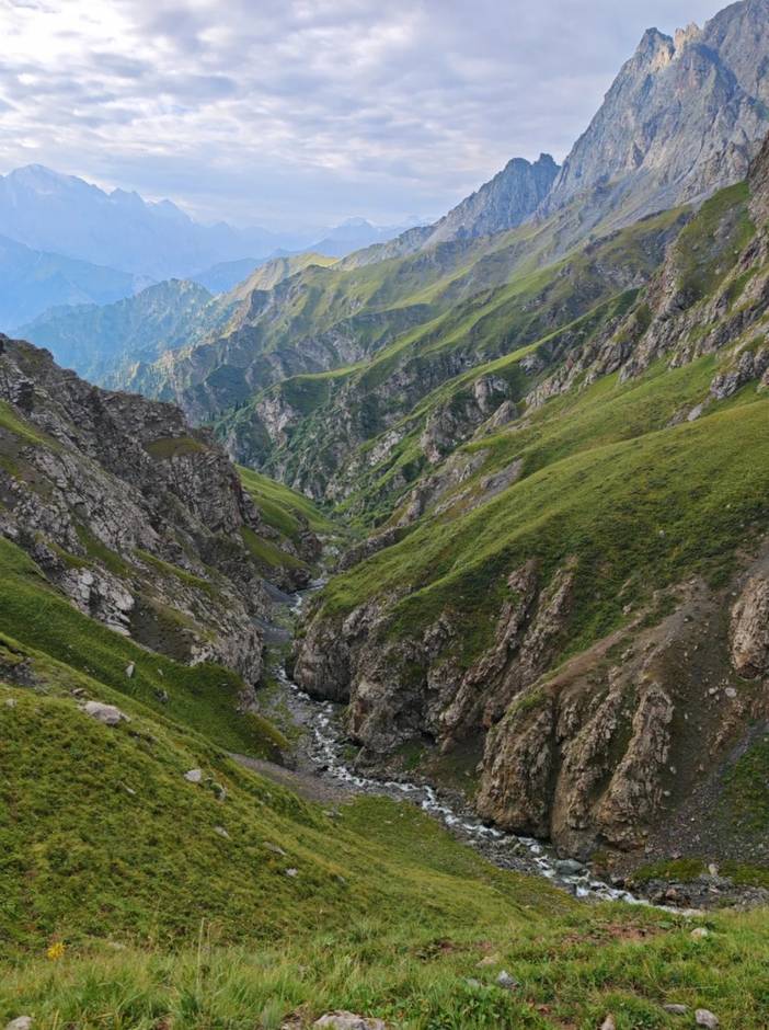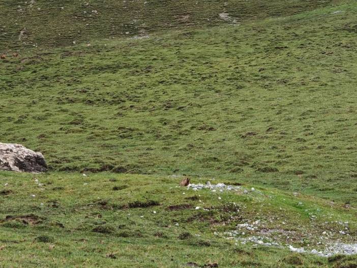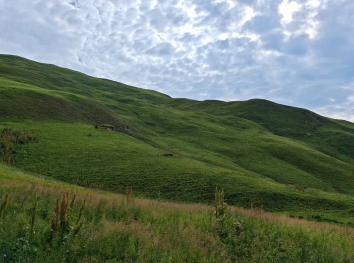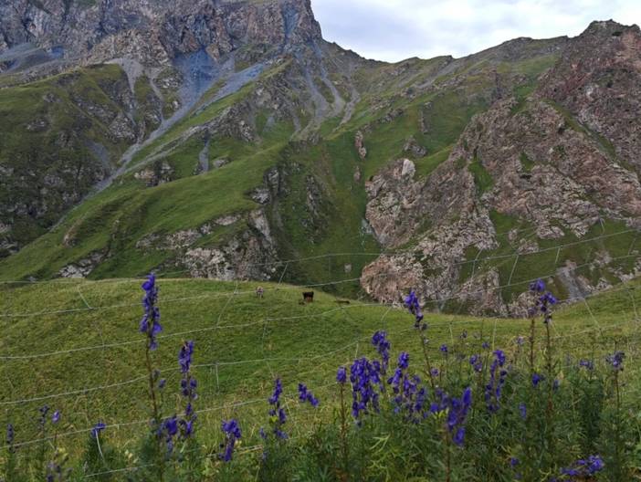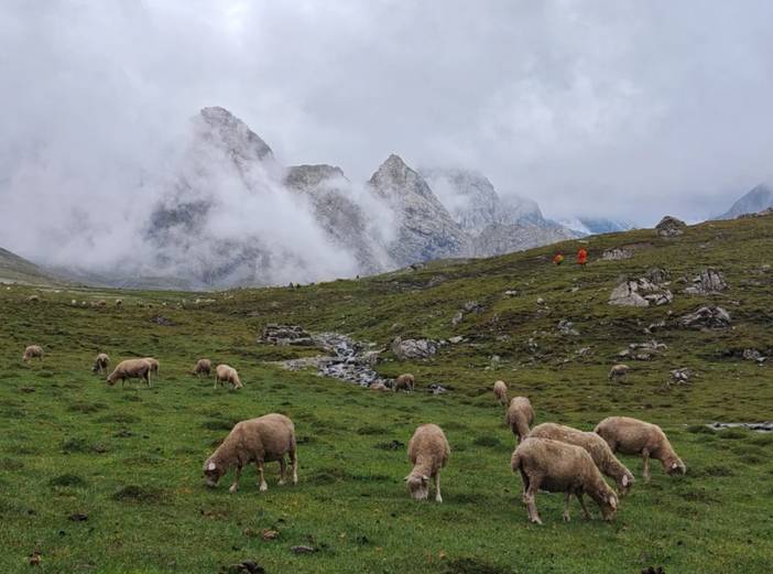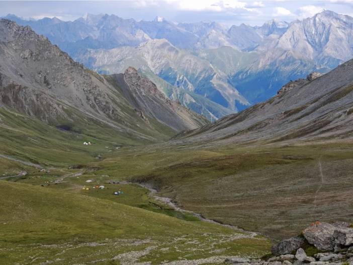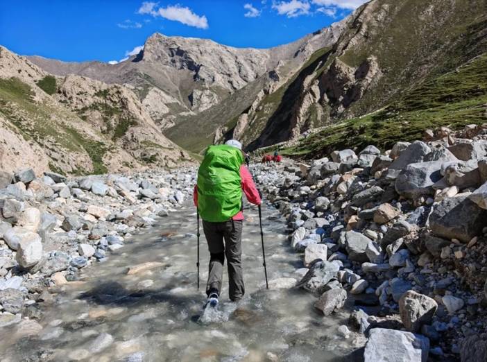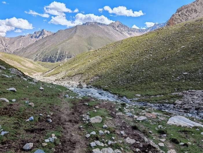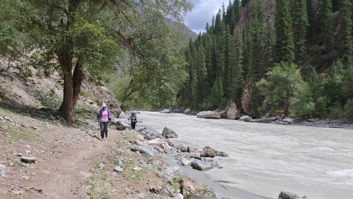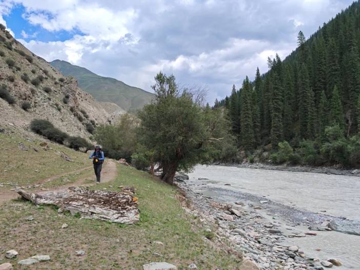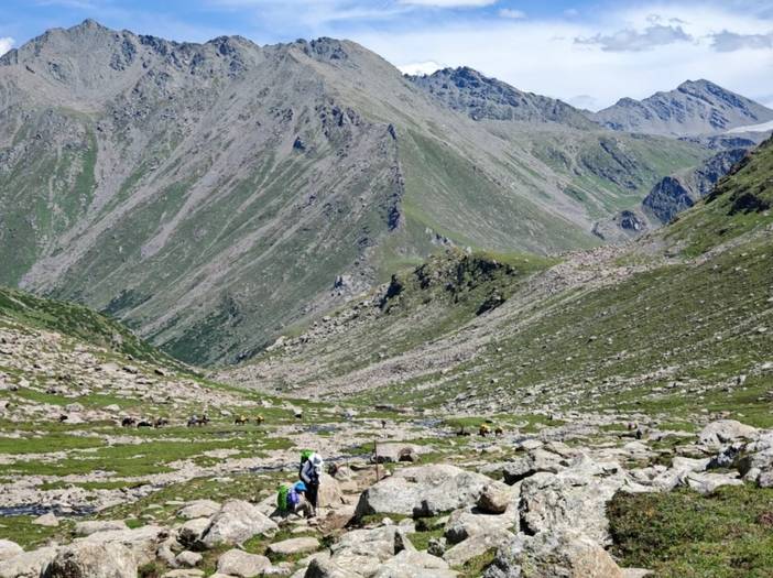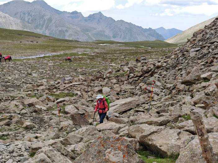 4)最后一天半的徒步是在南疆,前面都是在北疆。相对而言,北疆气候更为滋润,容易下雨,草场也好,放牧多。南疆的土地相对贫瘠,草地上石头较多,放牧的也少。在北疆河谷的徒步中,仿佛这里真真是世外桃源。