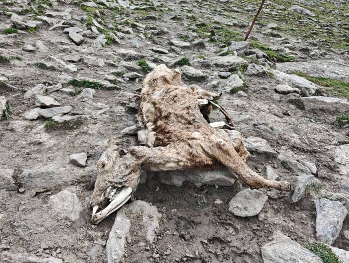 3)非正常死亡的牛羊马匹等,一般不会被食用,直接遗弃在野外。当地对于羊毛好像也不怎么利用,在天堂湖边有很多没人要的羊皮(很多团队会在这里吃羊肉,我们也是)。但是在徒步中又看到一个牧场有很多晾晒的羊皮。