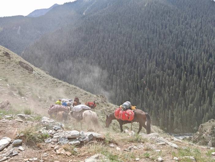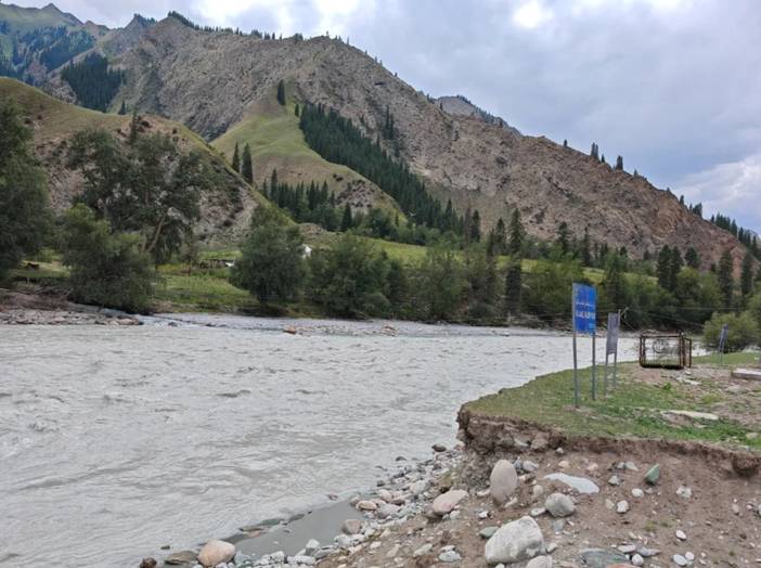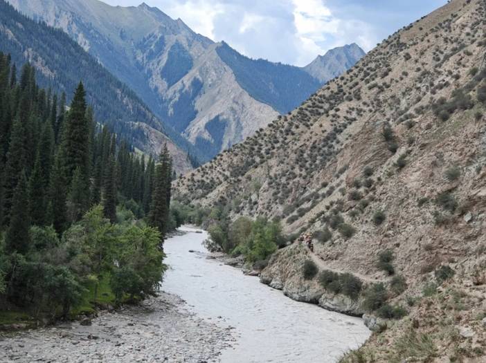 最终我们抵达了溜索桥,之所以叫溜索桥是因为,这里以前过河(科克苏河)是通过溜索,今年刚建了一座桥,这样就非常方便了。之前经常有马儿被冲走(马不能坐溜索)。这里有补给,饮料西瓜都有,其实车能开到这里(从另外一条路),有些不想徒步只想去天堂湖的,一般坐车先到这里,然后骑马一天可到天堂湖。坐车路况不是很好,有时候还不能通行。