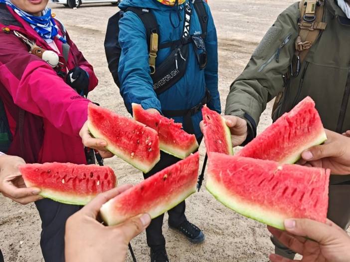 午餐为路餐,需要每人自己准备,关于路餐的建议是,买好吃的、想吃的、味道好的。并不建议买馕,因为太干吃不进去。可以买一些榨菜、火腿、牛肉干或零食等自己喜欢吃,并且能够刺激味蕾的。其实中午吃的并不多,我们每个人带的都没有吃完。