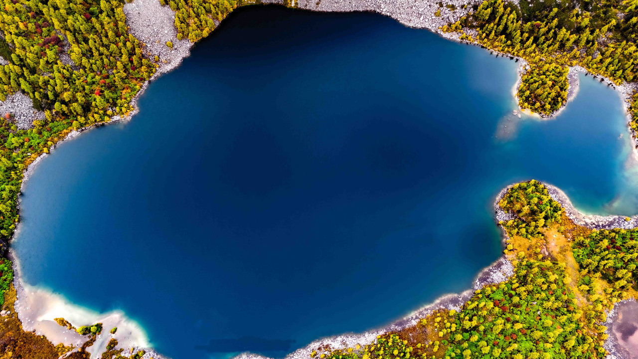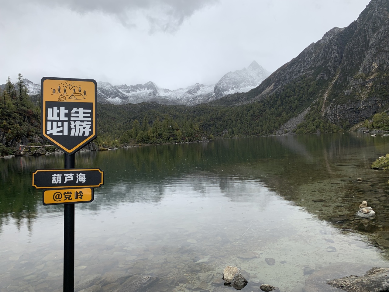 葫芦海是党岭的明珠,高山之中的宁静湖泊。处于几十座5000米以上雪峰的包围圈中,海拨约在4200米,第四纪冰川退缩后形成的高原堰塞湖,形如葫芦如提琴如宝镜,湖泊清透平静,美妙倒影奇光异色,海子的侧畔,一株株红杉挺拨而遒劲,茂密而干练的针叶由绿变红。远处群峰簇拥,那是横断山之大雪山绵延的山脉,最高峰夏羌拉雪山海拨5470米,终年积雪,雾雪菲菲中不时露出苍茫和峥嵘,裸露出她那清纯而动人的肌肤,似利剑般直插云霄。雄鹰在长空翱翔,盘旋在雪花雾气云海蓝天下。