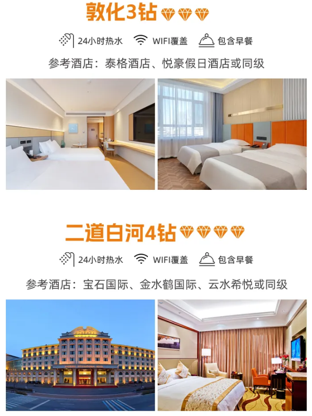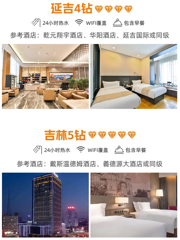 备注:酒店钻级参考标准:3钻为当地舒适型酒店、4钻为当地高档型酒店,5钻为当地豪华型酒店,东北经济发展较南方相对落后,与大城市同级别酒店略差