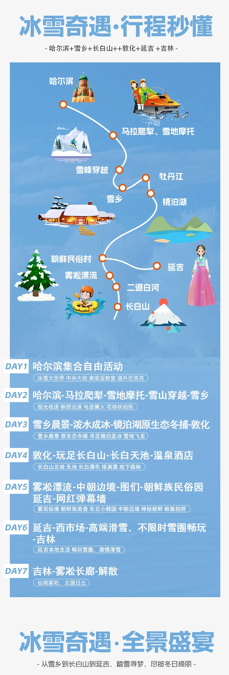 【门票】全程门票:林海雪原徒步、雪乡门票+环保车票、长白山北景区全门票(包含门票+景交车票+天池导站车)、漂流门票、图门口岸友谊桥门票、延吉朝鲜族民俗园门票、吉林滑雪场滑雪(含雪杖/雪板/雪鞋/雪圈)。