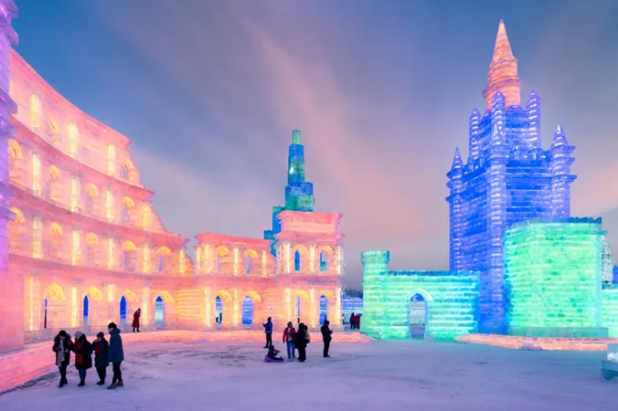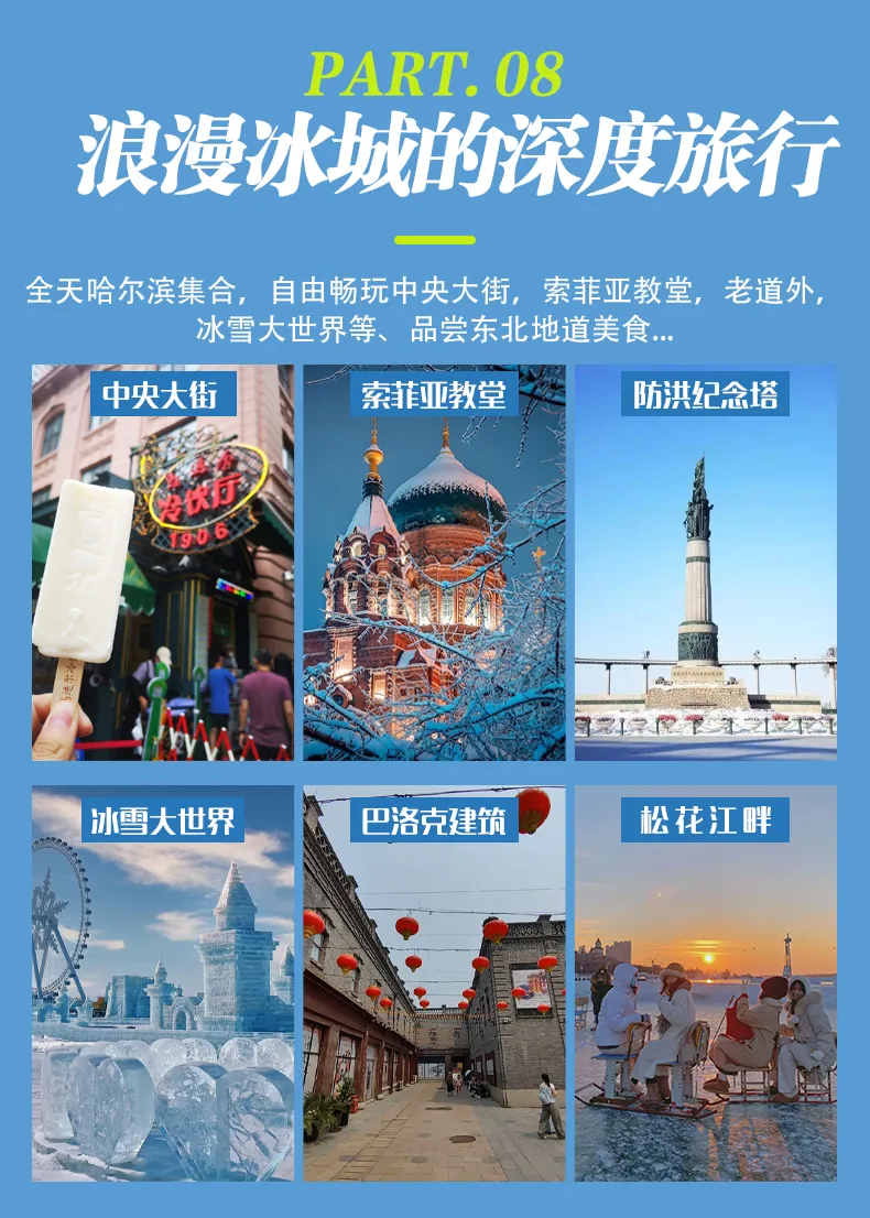 夜晚:自行前往【冰雪大世界】(建议16:00后入园),欣赏璀璨冰灯,体验超长冰滑梯、雪地爬犁等项目。夜宵可尝试东北烧烤配哈尔滨啤酒,感受东北夜生活。