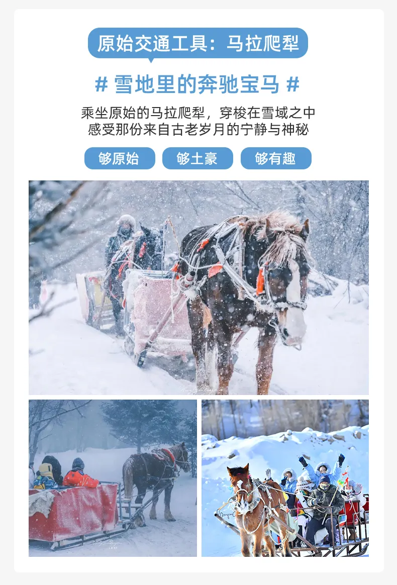 在亚布力,我们将体验最原始的雪地交通工具——【马拉爬犁】。听着马蹄踩雪的咯吱声,铃铛清脆作响,仿佛回到了那个"交通基本靠走,通讯基本靠吼"的纯真年代。
