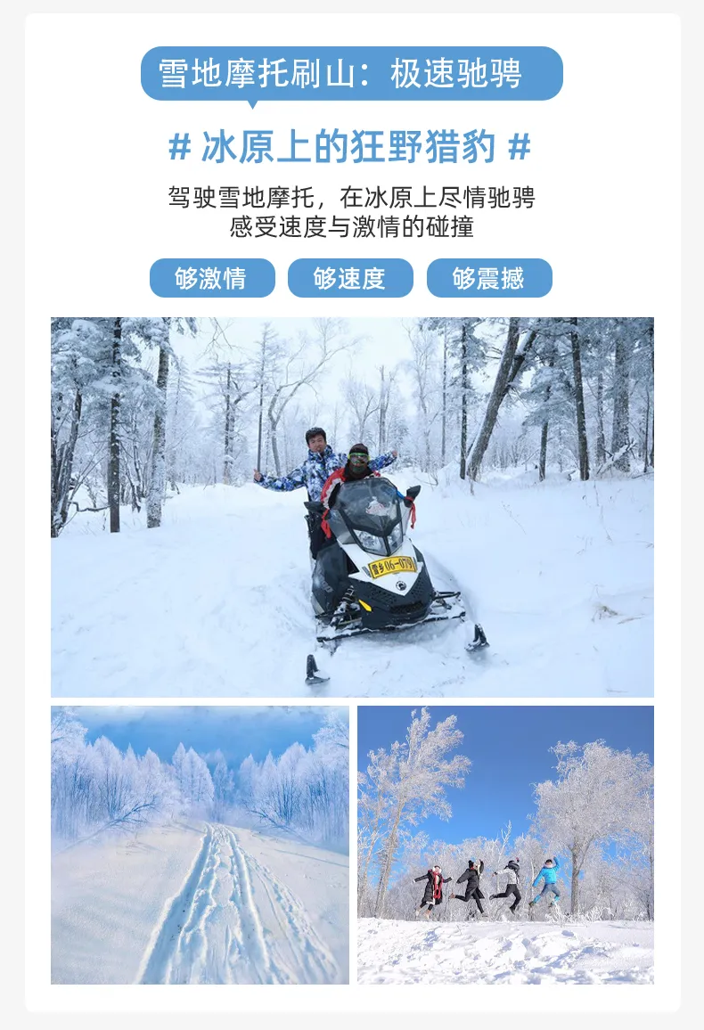 紧接着,让我们跨上【雪地摩托】,在无垠的雪原上尽情驰骋。风从耳畔呼啸而过,溅起的雪花在阳光下闪闪发亮,这一刻,我们都是自由的追风少年。