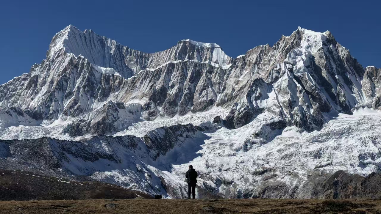 库拉岗日不是一个山峰,而是雪山群,附近集中分布有6座7000米以上的山峰。远远望去,终峰并肩,宛若一道顶天立地的冰雪屏障,山脊的南北两侧是壁立千仞的基岩陡崖,峡谷中横卧着四条冰川,北侧的两条均长达10公里。
