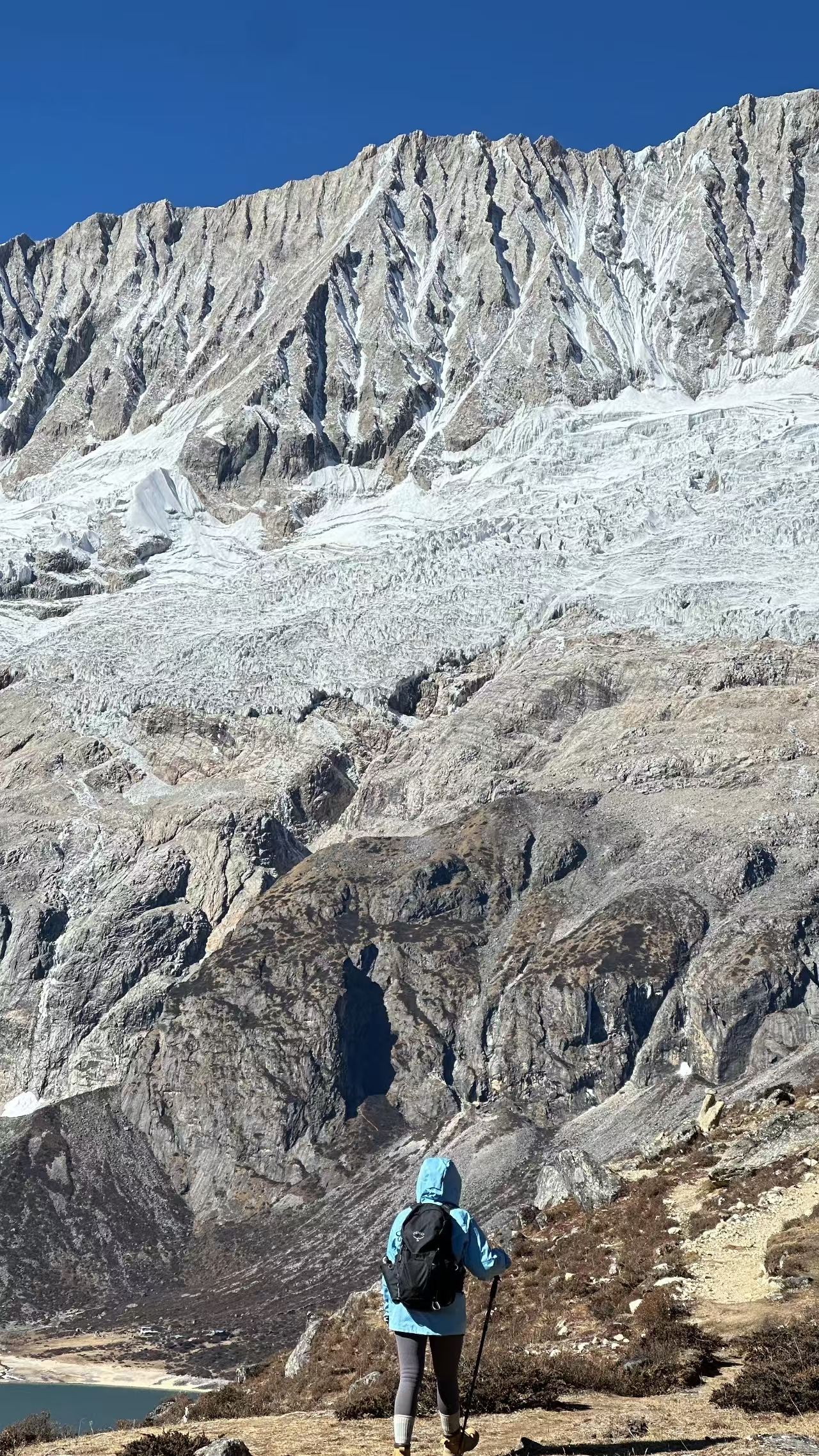 徒步行进到冰川下方,欣赏如蓝冰般的冰川和雪山。沿湖而行,在光线的作用下,白马林措的湖水呈现出不同的颜色。当天的徒步有两种方式,往返和环湖。