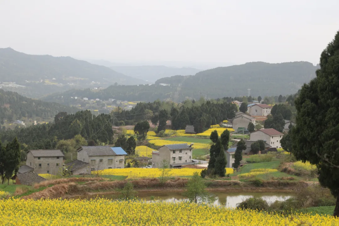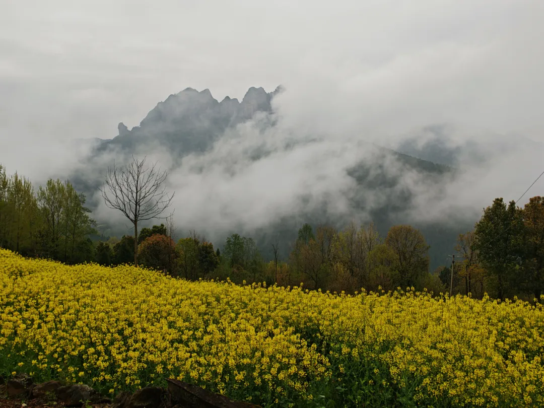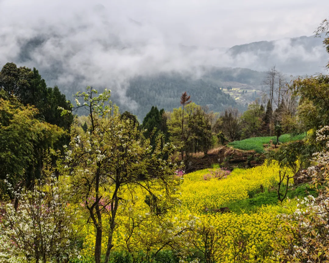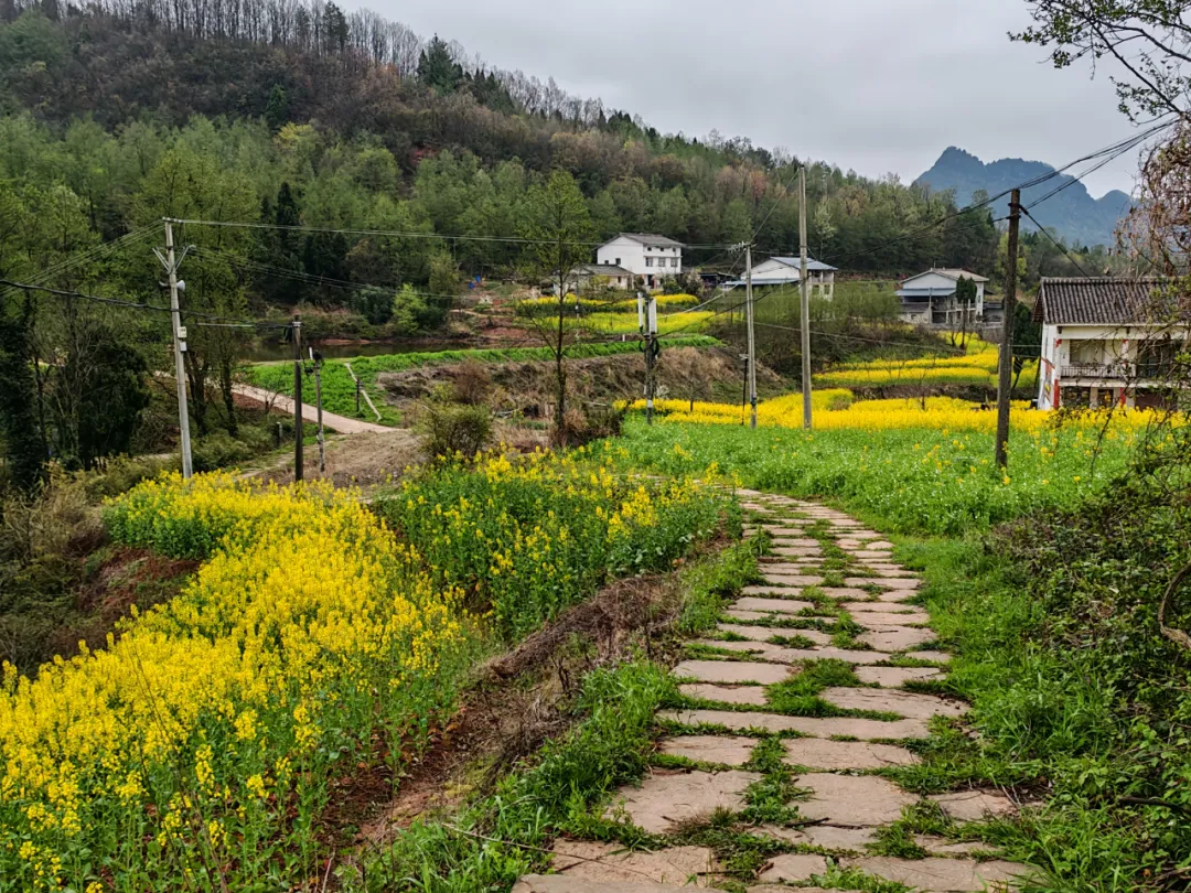 3、除了古道,还有沿途自然景观,目前有很多油菜花及梯田,梨花、桃花、樱花、油菜花等,共同构筑了一条经典的徒步线路,第二天的徒步还能够看到剑门关景区所在的大剑山。