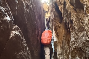 这是一条户外人专门开发的线路——蛙跳峡,被誉为南太行最窄的峡谷,谷底最窄处不超过半米,仅容一人勉强通过,谷顶端最窄处不超过1米,而深度在100米以上。峡谷中以攀爬为主,大概像青蛙一样跳跃更容易通过,户外爱好者起名为蛙跳峡。