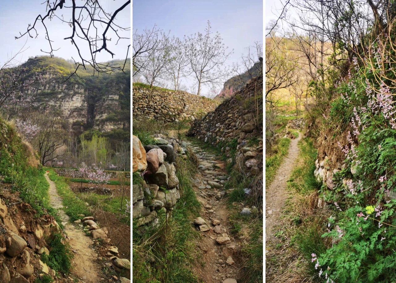峡谷及村子里桃花、杏花等争相开放,感受春天的气息,识花找野菜