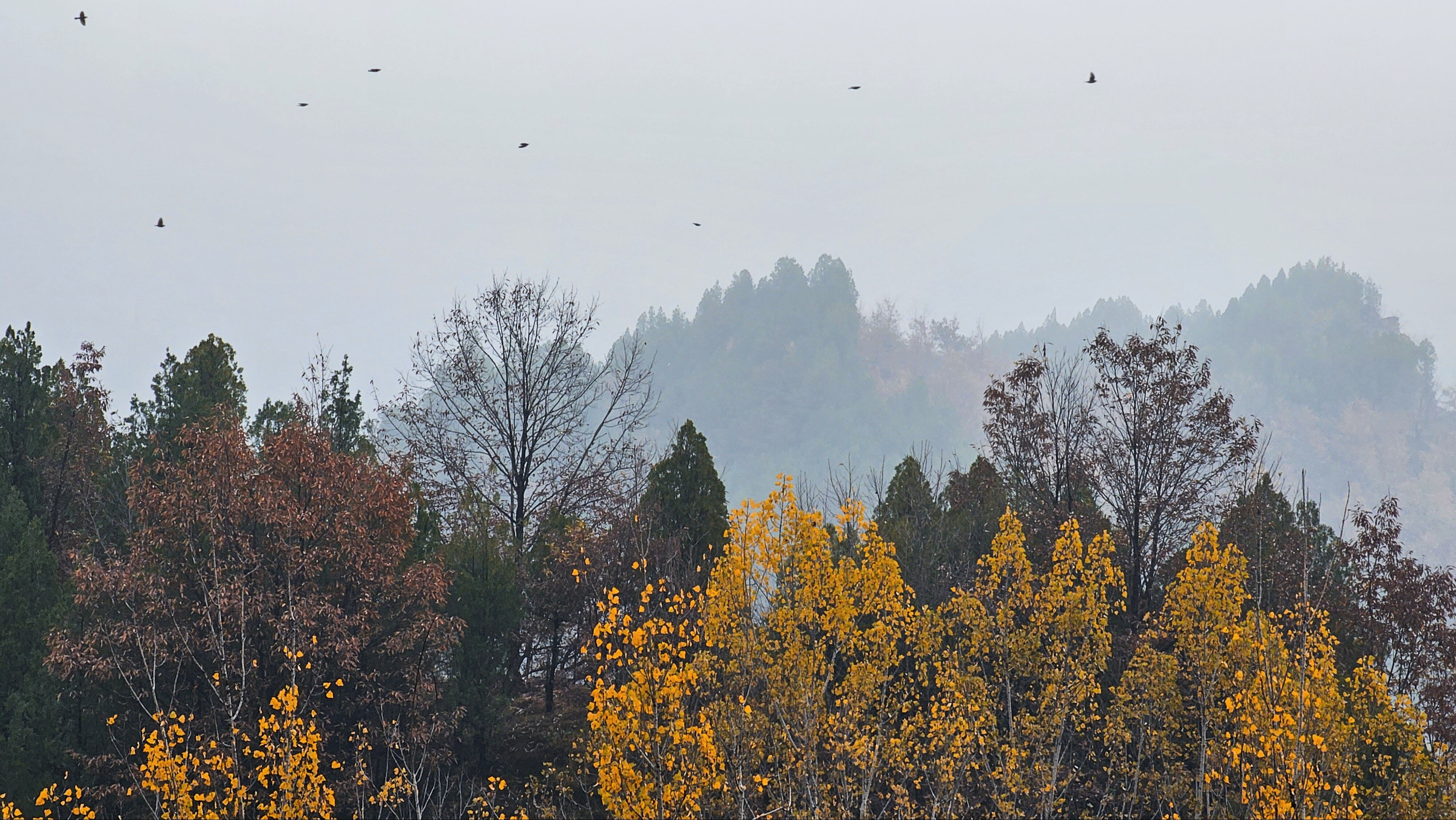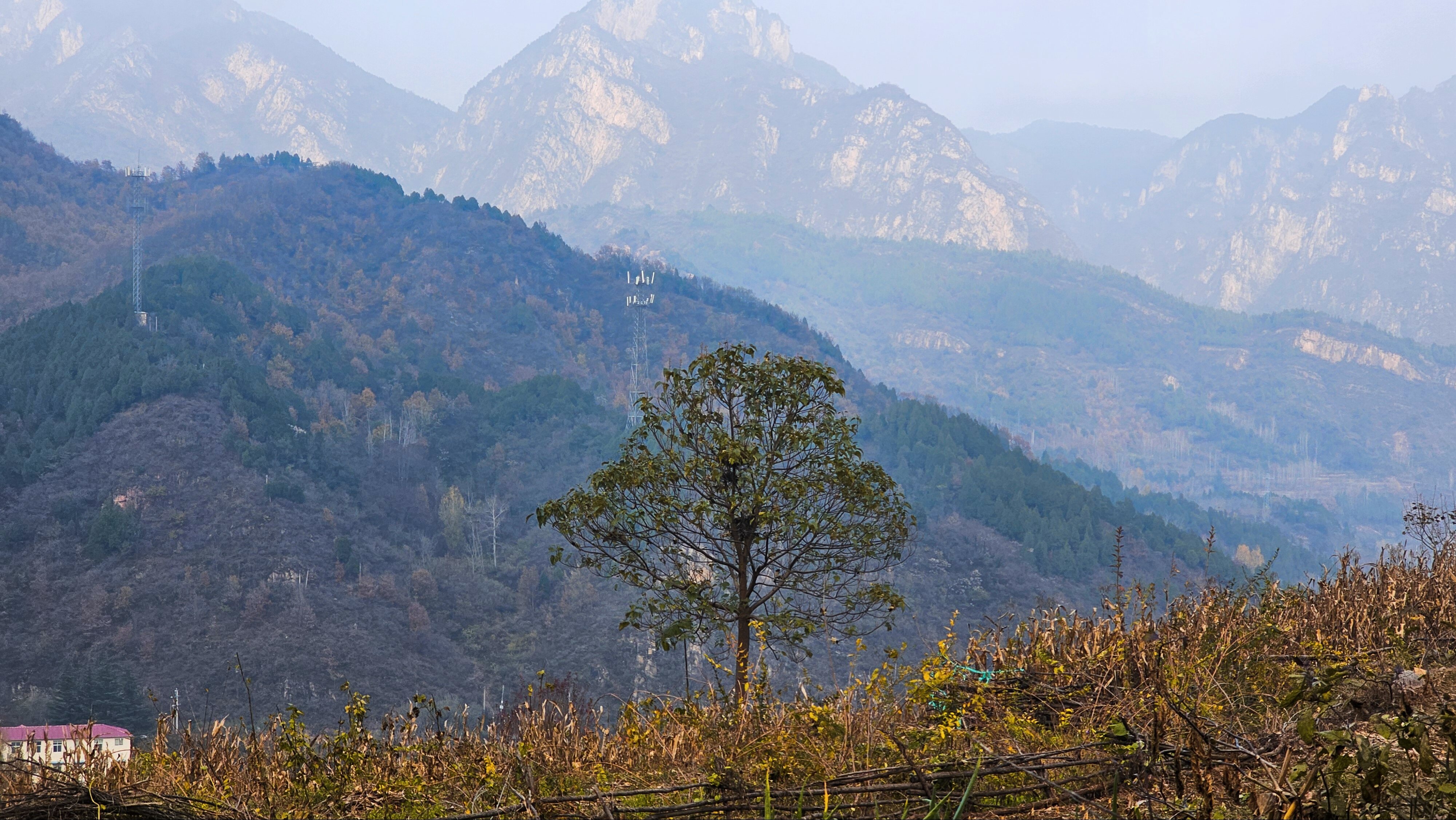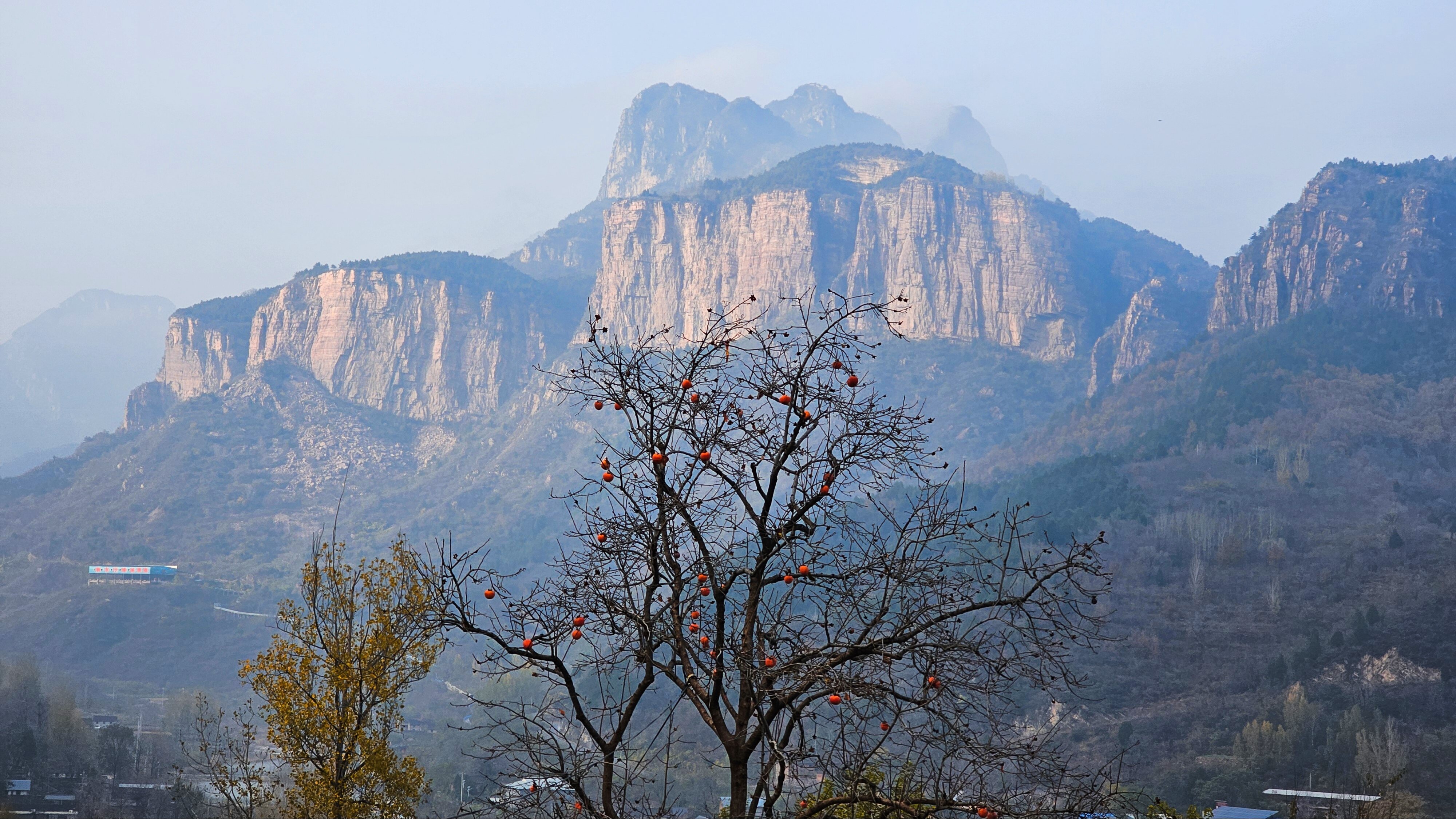 - 七峰环绕,最高点蚂蚁山1657米,秋日层林尽染,山楂红透如画。
