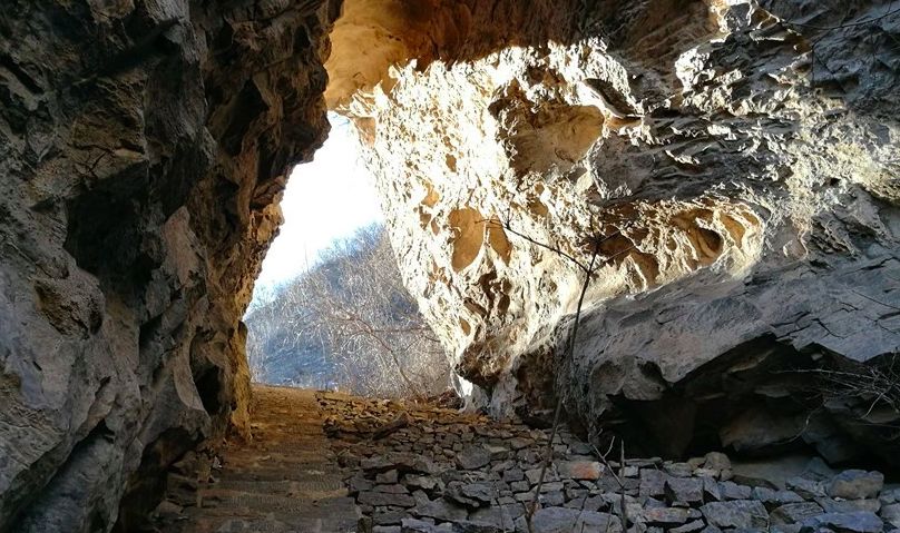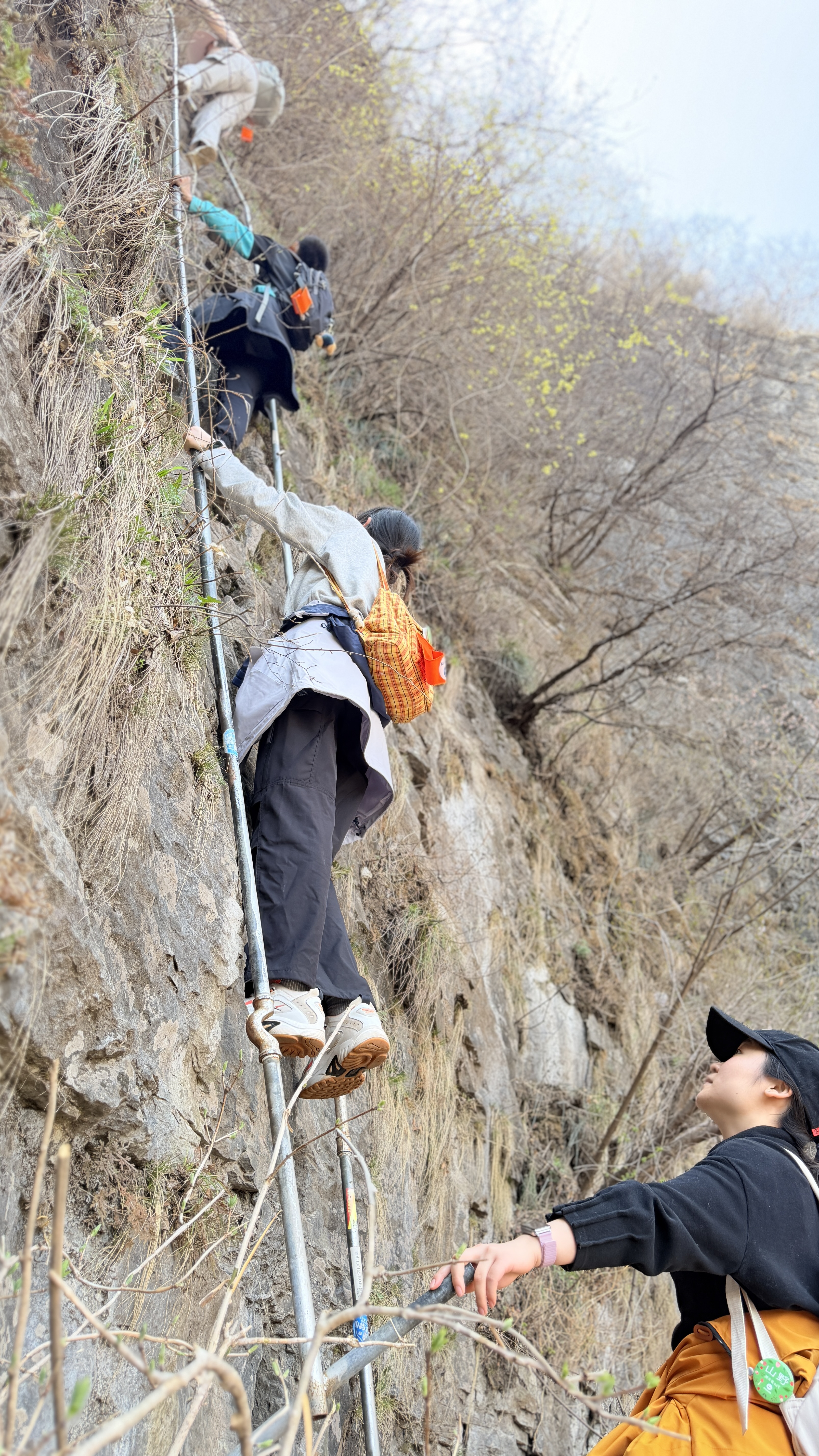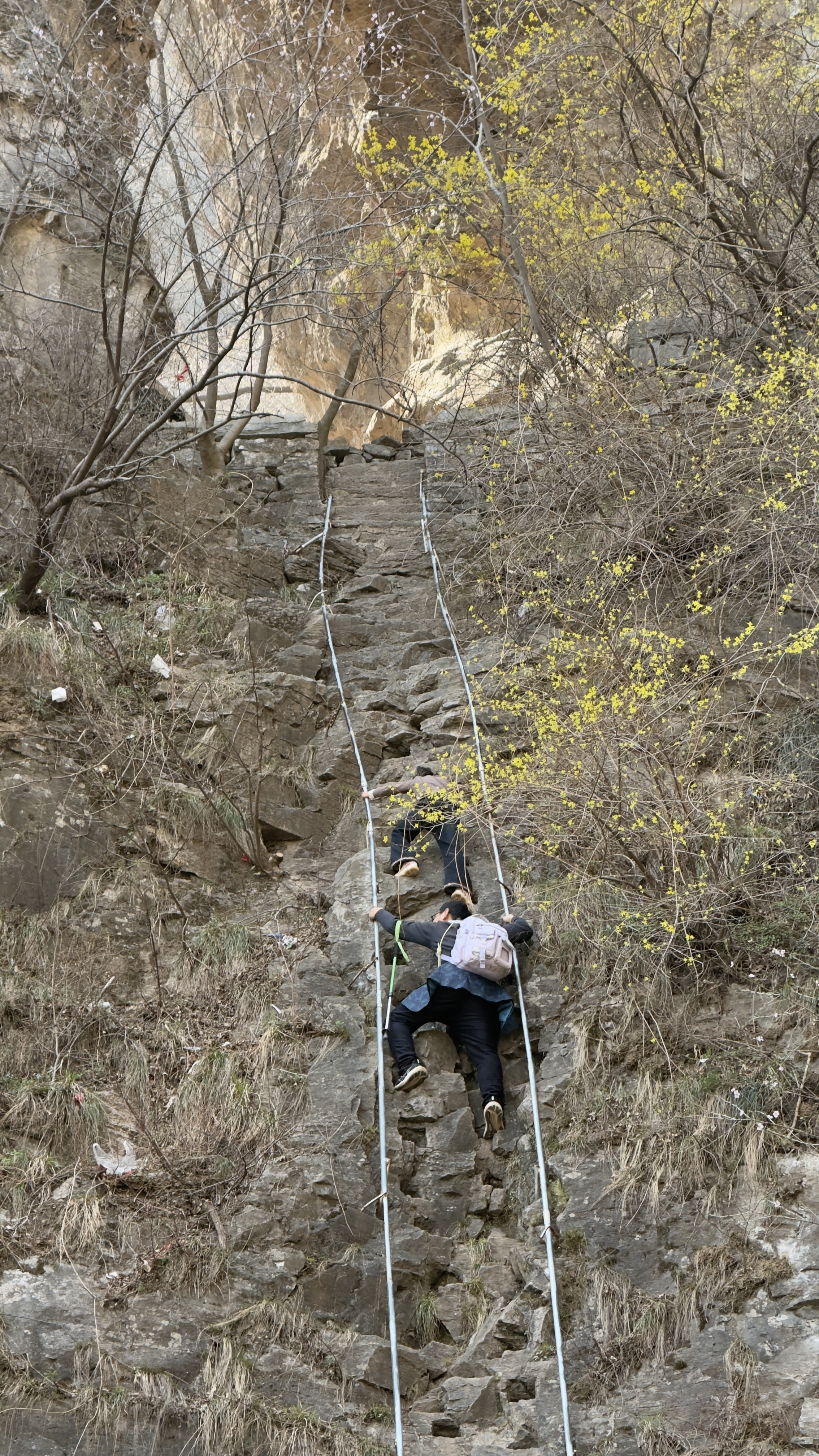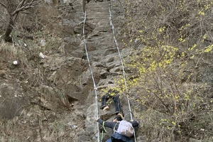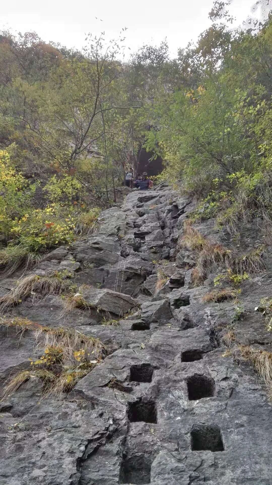 手扒岩是一堵将近九十度的绝壁,大约八九米高,光秃秃的,只能用手扒着石缝上,听起来很险,其实真正攀爬起来并不困难。当地村民在光滑的石壁上凿出了一些石窝,用来放手、脚,如此就非常容易了。目前两边已经修建了栏杆,已没难度。